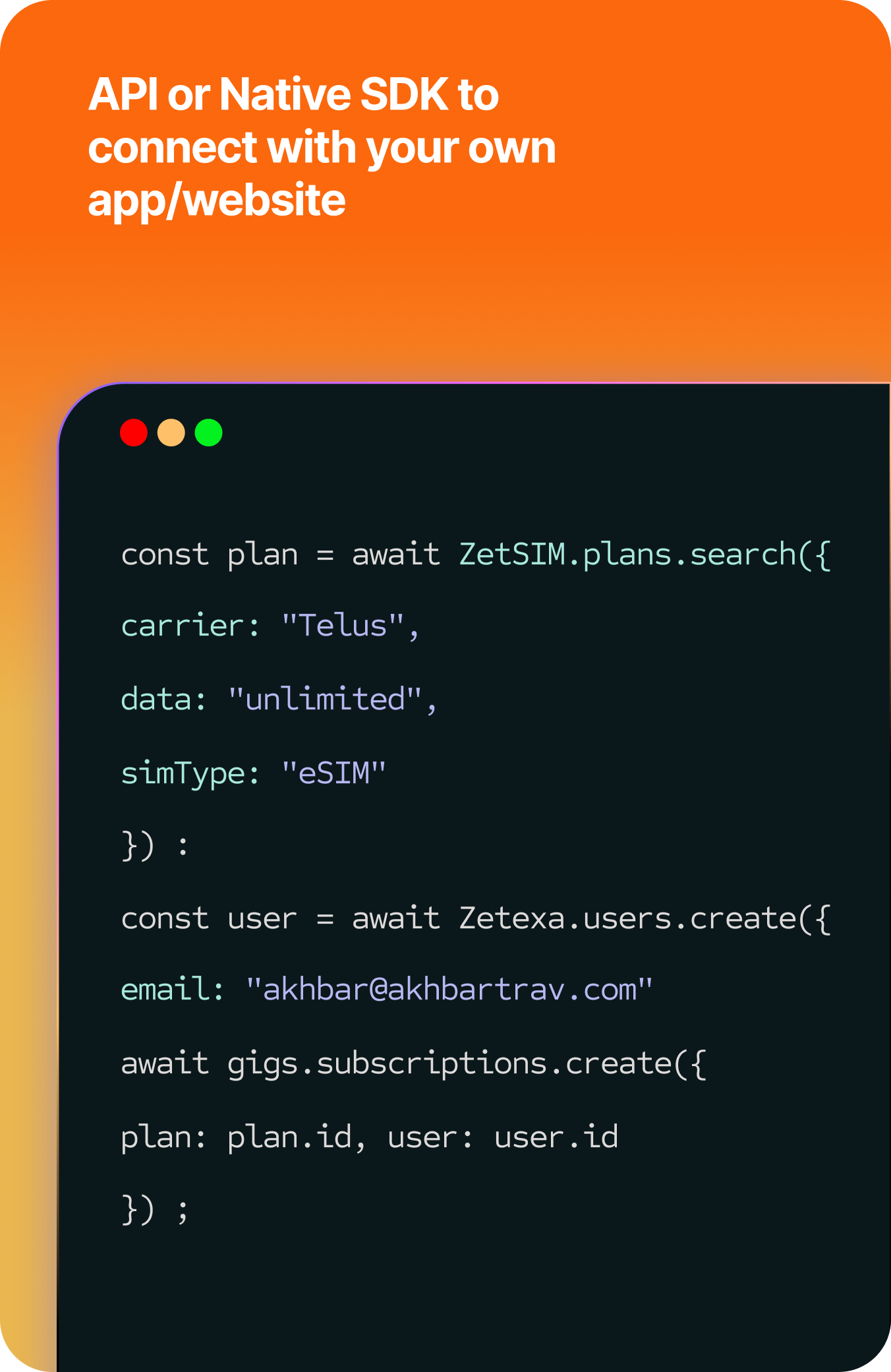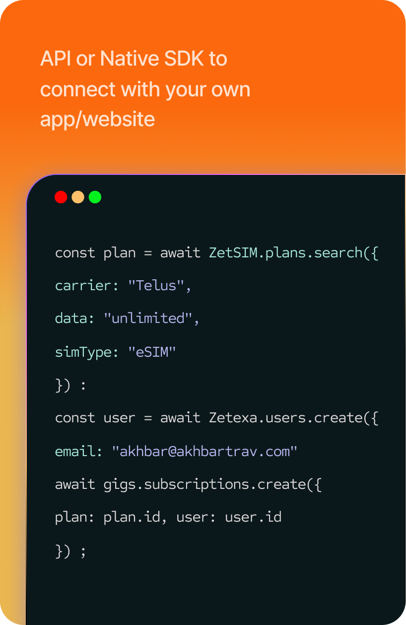Launch a fully automated mobile service powered by APIs. Add global eSIM capability to your own app or platform. Our easy API and SDK deliver seamless provisioning, device compatibility checks, unlock detection, and real-time status monitoring. Compatible with iOS and Android.