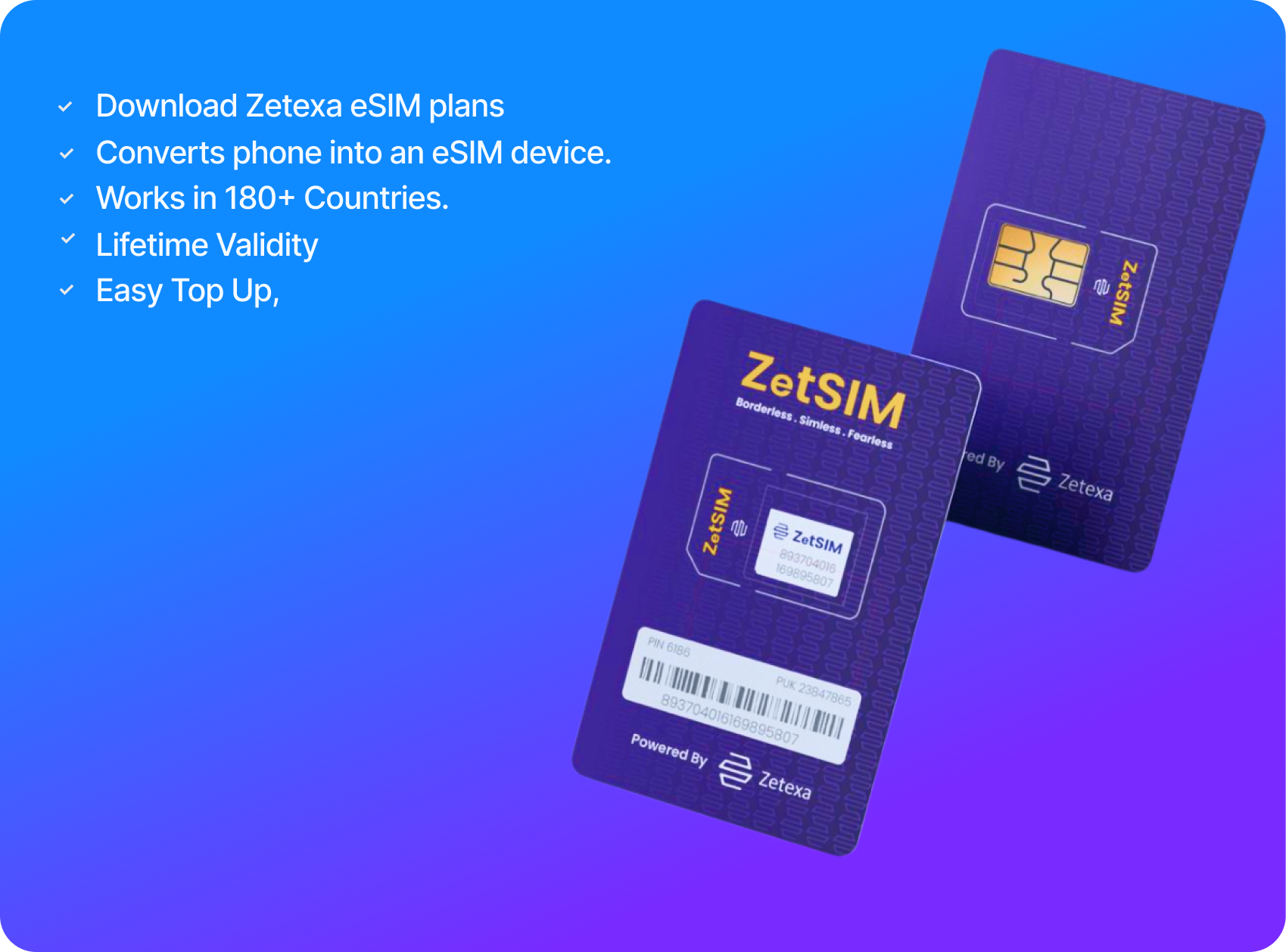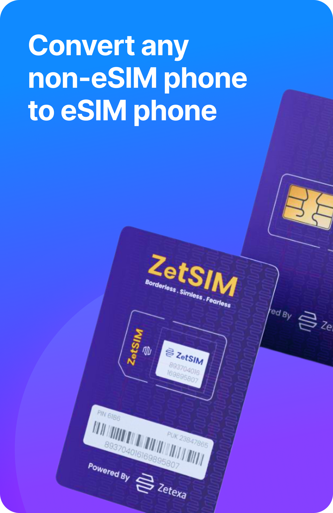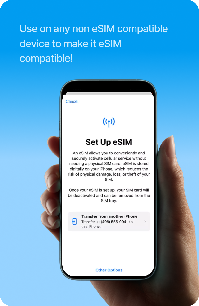 Our magic SIM helps you use eSIM on any non-eSIM phone, by converting it into an eSIM-enabled device. Easily download Zetexa eSIM plans, enjoy seamless connectivity across 180+ countries, with lifetime validity and simple top-ups.