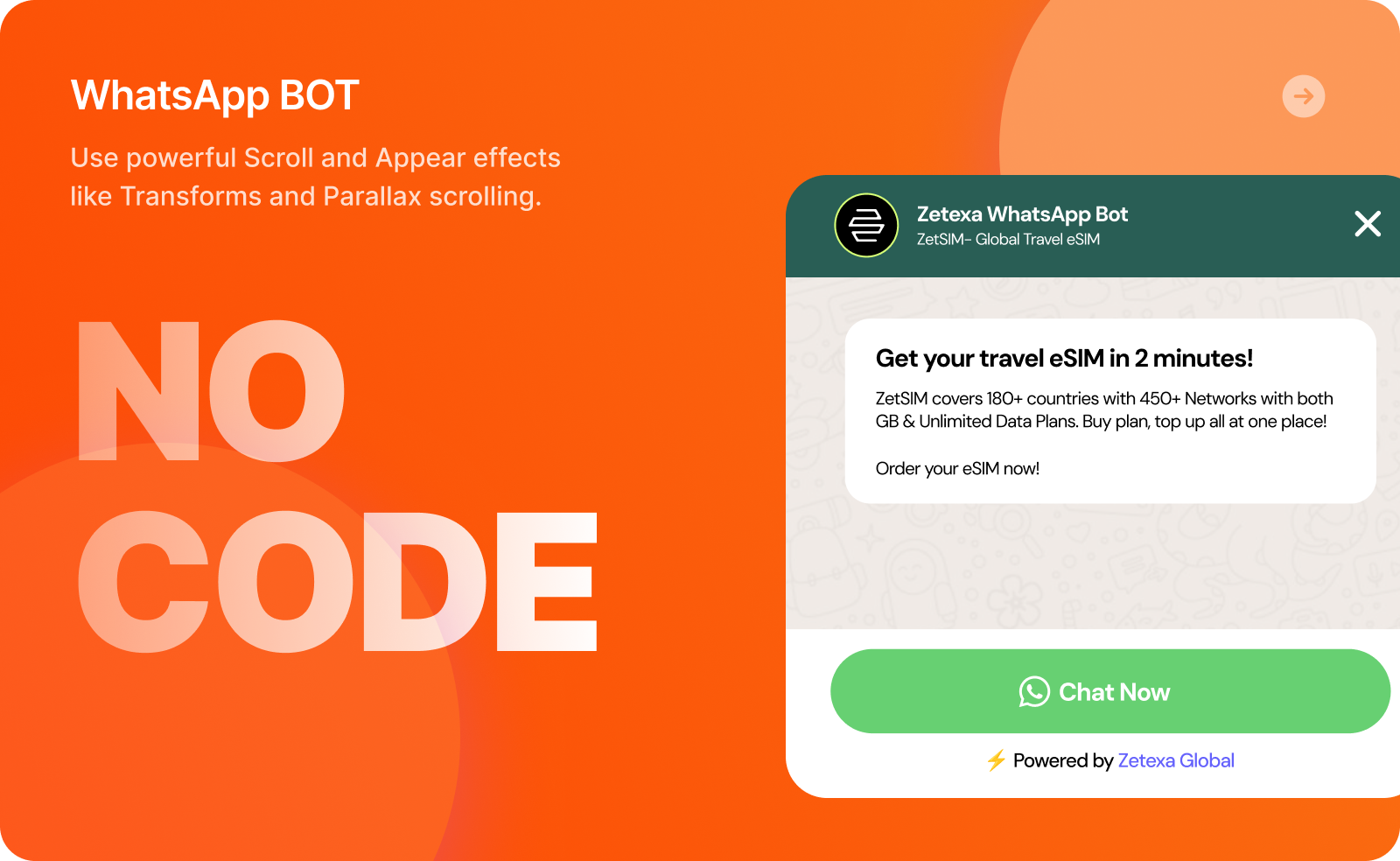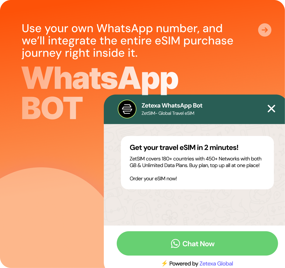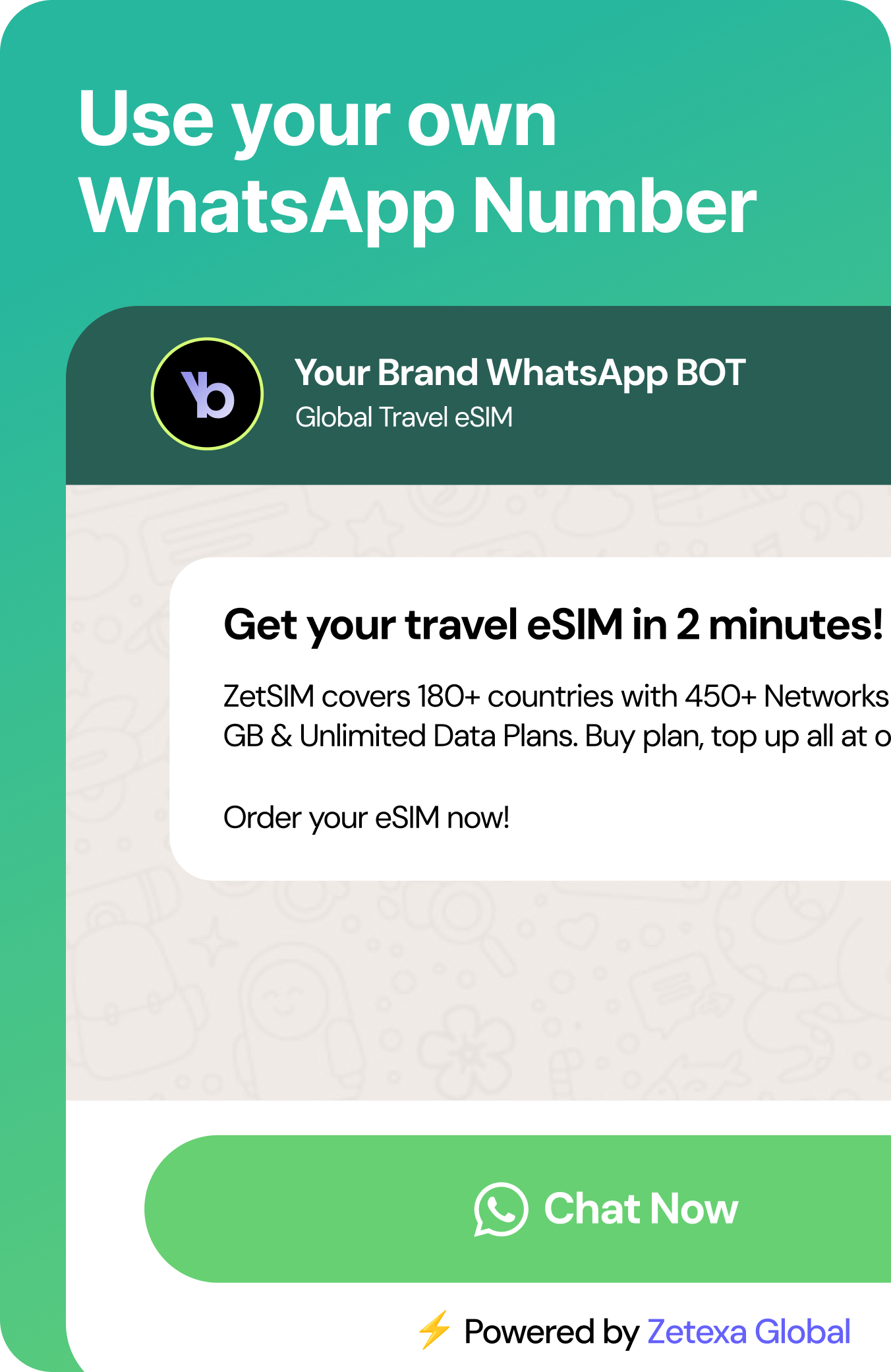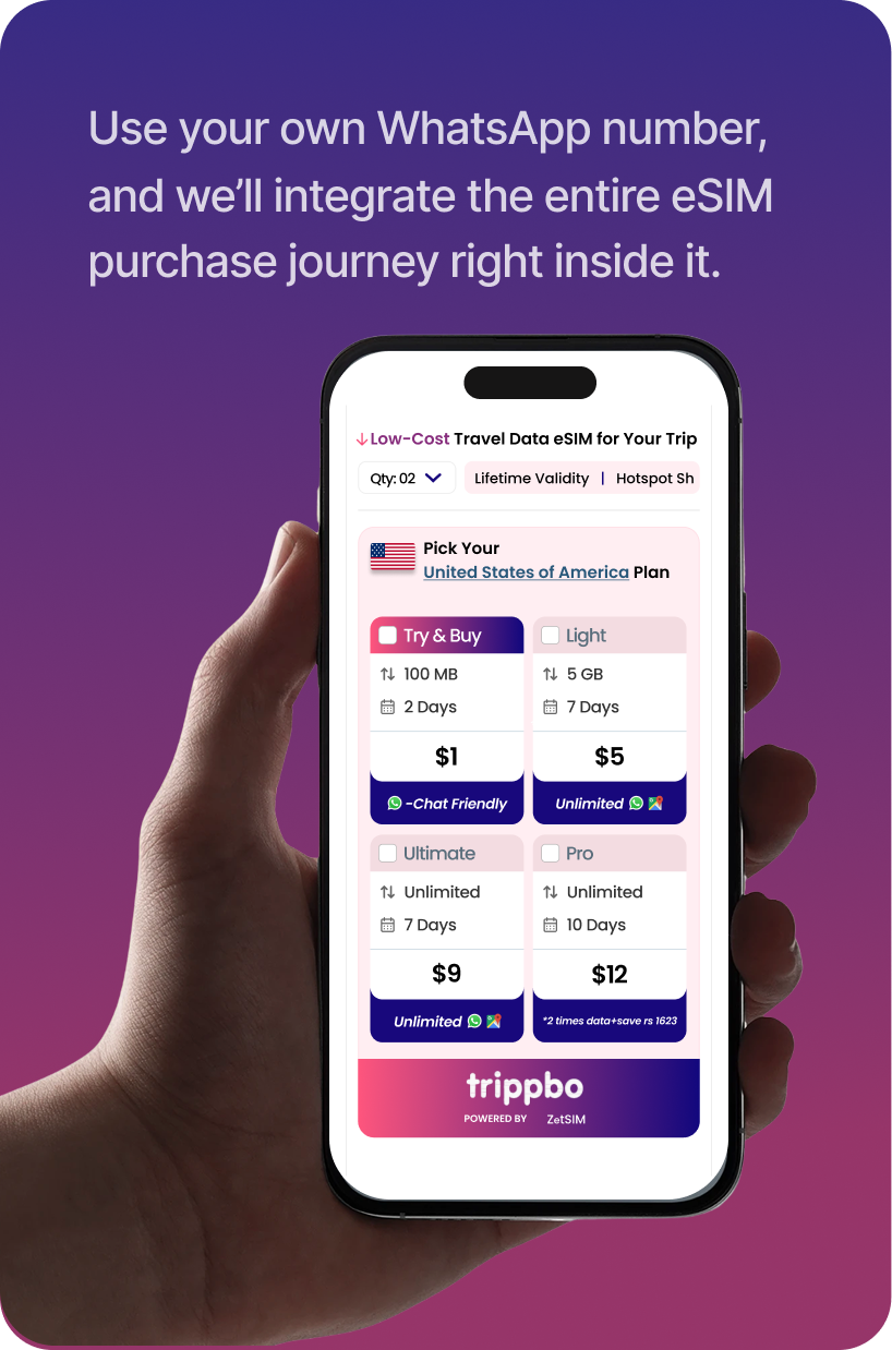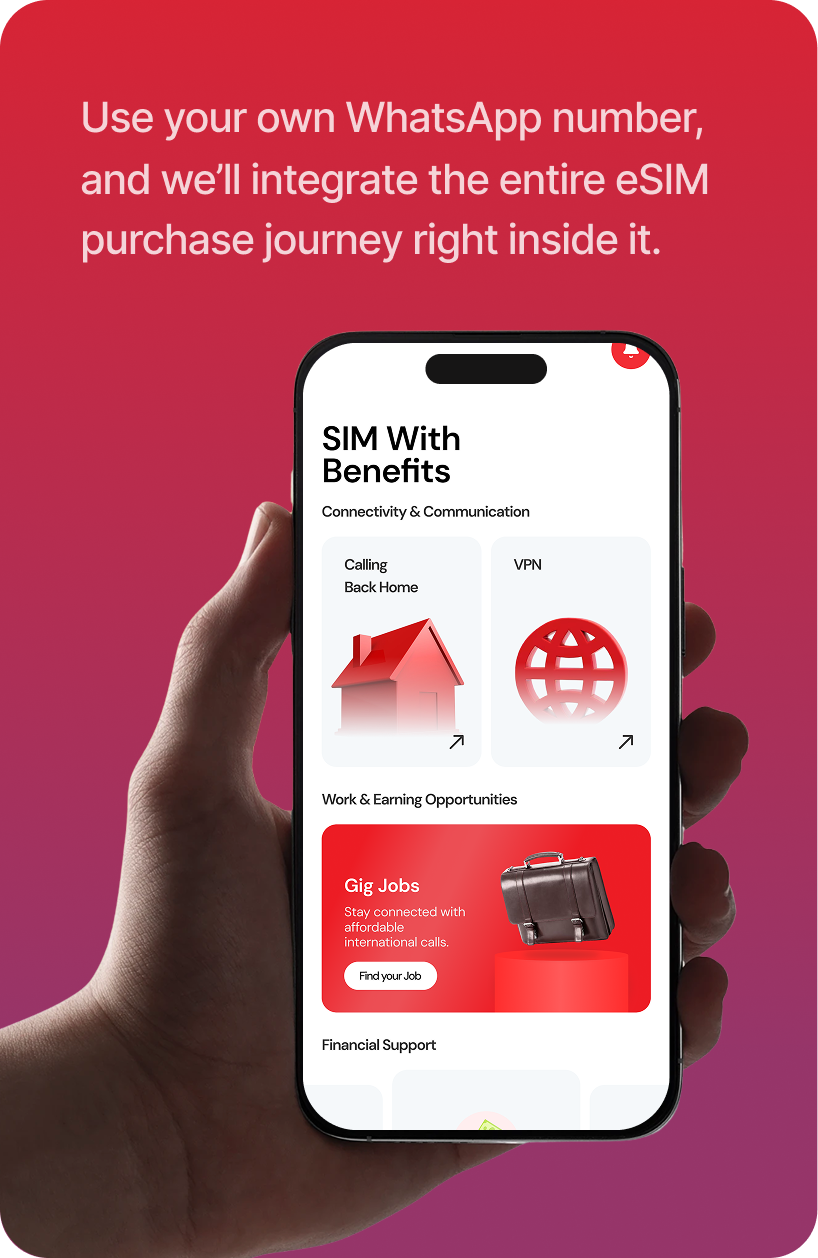 Launch a fully automated mobile service on WhatsApp. Just bring your WhatsApp number, and we’ll set up the entire eSIM purchase journey inside your own WhatsApp bot. Our plug-and-play workflow handles destination, pack selection and payments — all within WhatsApp.