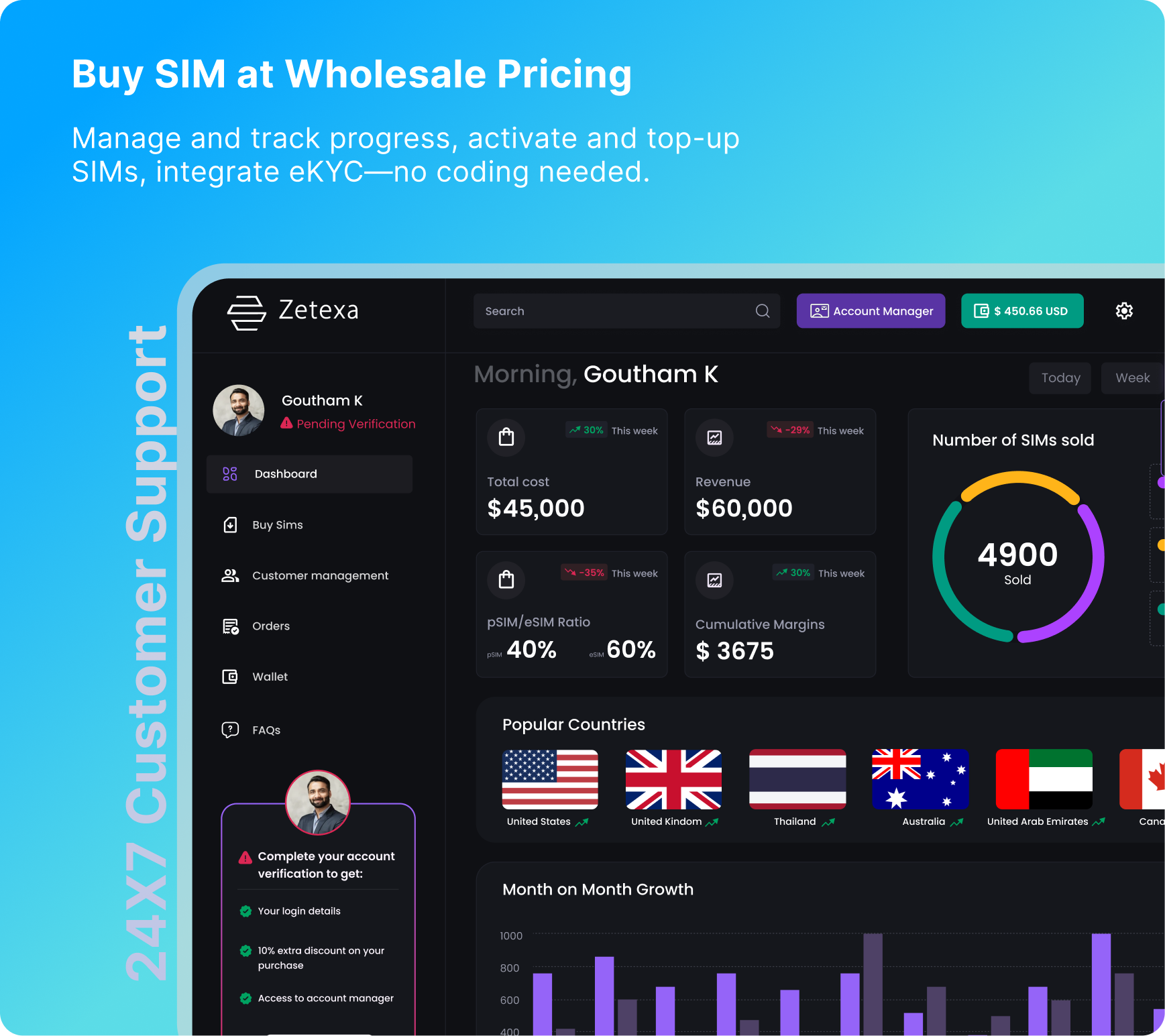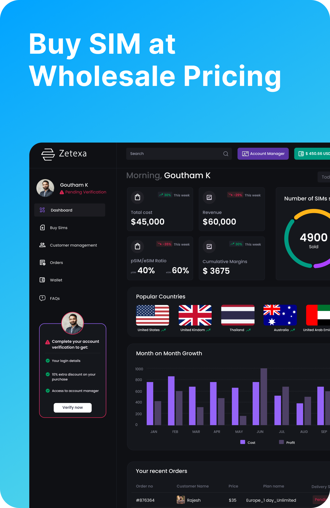 The reseller dashboard gives you everything you need: manage and track growth, activate and recharge SIMs, and run eKYC instantly—no coding needed.